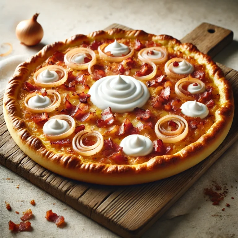 Kend meg a tészta tetejét tejföllel, majd egyenletesen oszd el rajta a vékonyra szeletelt hagymát és a szalonnakockákat.